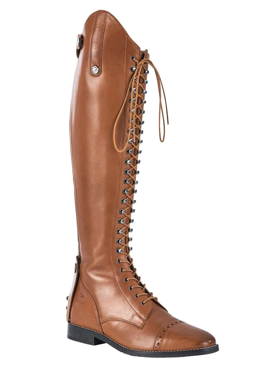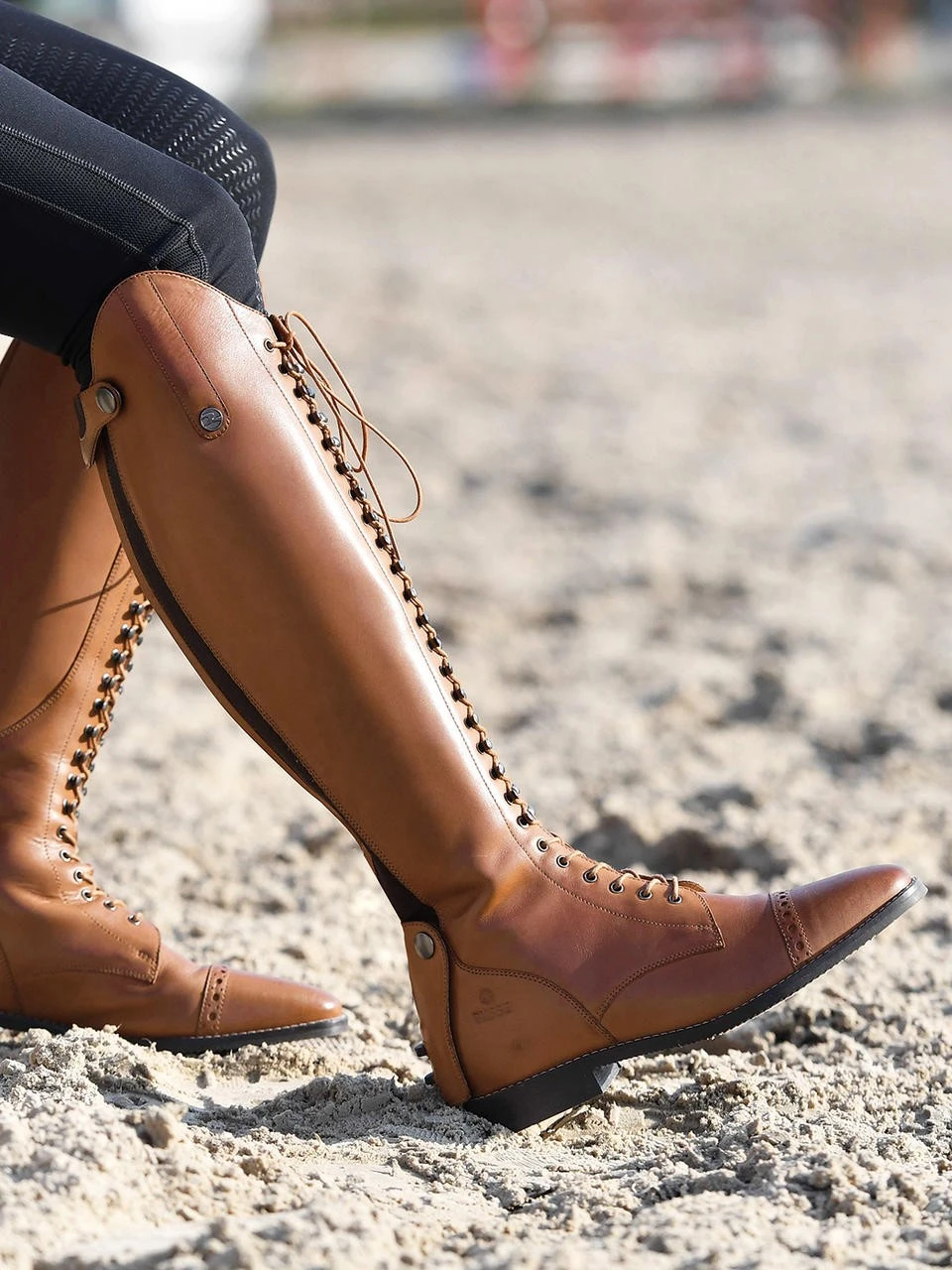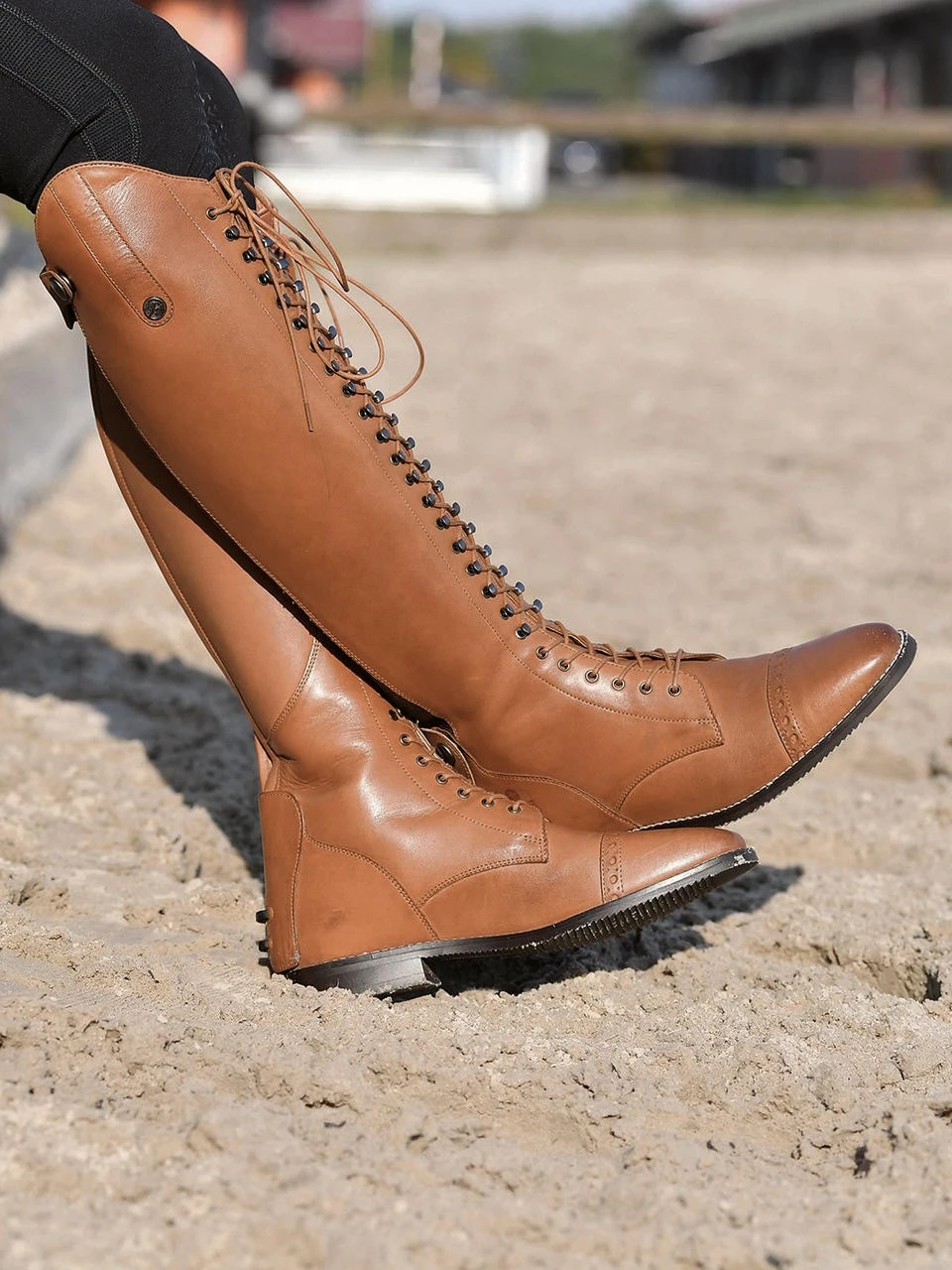 Der Lederreitstiefel Laval in cognac von BUSSE ist ein Reitstiefel mit angesagter Polo-SchnĂĽrung.