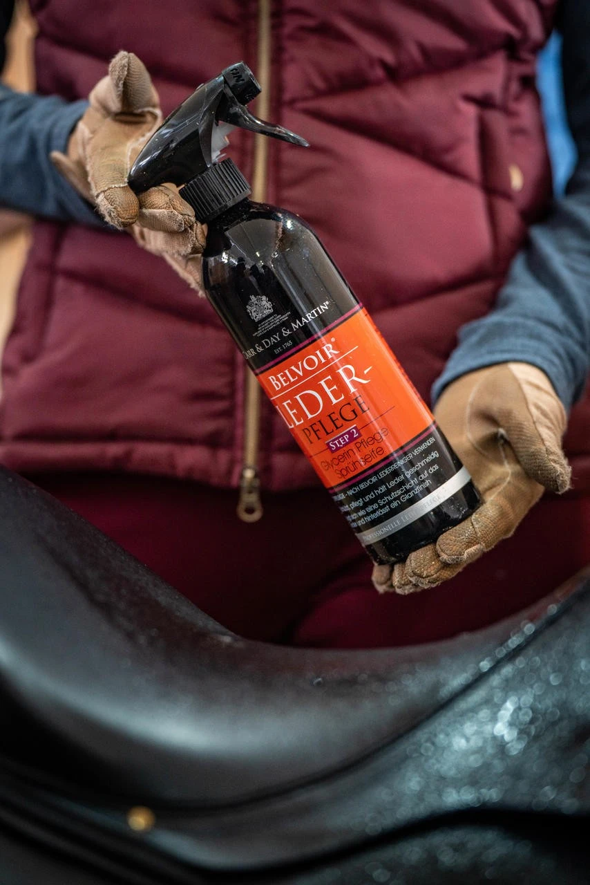 Die Belvoir Step-2 Lederpflege (Belvoir Tack Conditioner) von CARR & DAY & MARTIN erweicht, konserviert und bringt das Leder zum Glänzen.