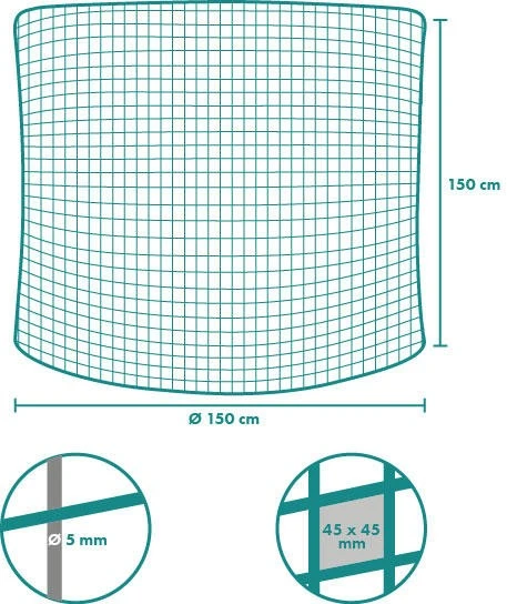 - Erhältlich in den Größen 140 cm, 150 cm, 160 cm, 180 cm. Die Größenangabe bezieht sich auf die Höhe und Durchmesser der Netze (Höhe = Durchmesser).