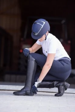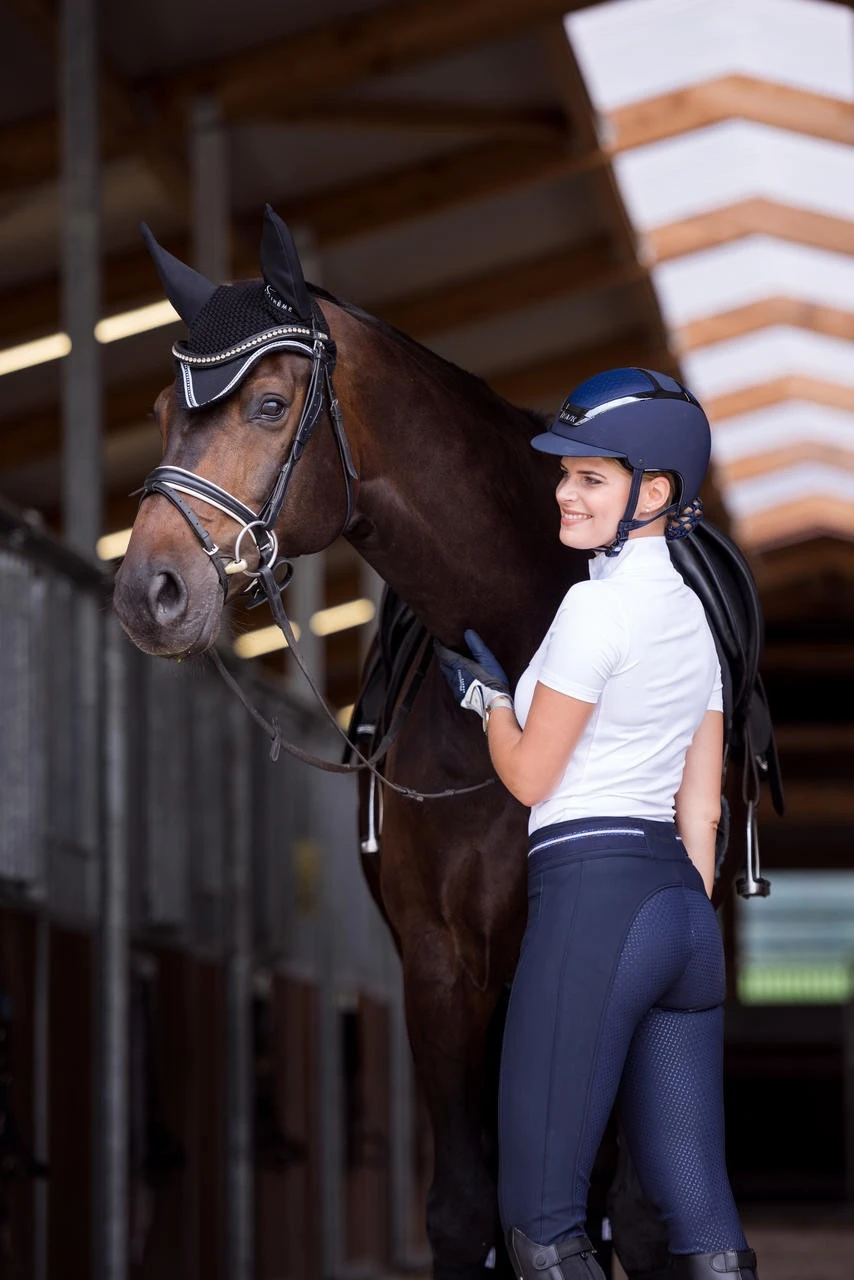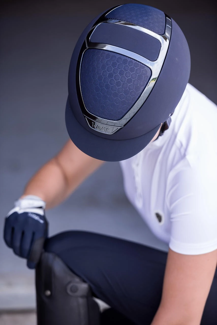Zu 100% in Italien entwickelt und produziert, verbindet der Dogma Chrome Light Stil, Design und Funktionalität in höchster Form. Seine Eleganz und seine einzigartigen technologischen Details gewährleisten dem Reiter Komfort, Sicherheit und beste Leistung. Die geformte Außenschale aus ABS ist äußerst widerstandsfähig und leicht. Er ist mit einem speziellen Textilmaterial überzogen, das wasserdicht, kratzfest und waschbar ist. Darüber hinaus ist der weiche Kinnriemen aus Ökoleder hypoallergen, waschbar und beugt Hautirritationen vor. Dies verleiht dem Modell, das aufgrund seiner Passform und seines Designs von den anspruchsvollsten Reitern sehr geschätzt werden wird, eine stylische Note. Die komfortable und atmungsaktive Innenpolsterung besteht zu 100% aus Merinowolle: Eine antibakterielle Naturfaser, in der Lage ein einzigartiges Niveau an Atmungsaktivität und Temperaturregelung zu bieten. Die Innenschale ist aus Schaumpolystyrol gefertigt und zeichnet sich durch drei verschiedene Dichtegrade aus, um absoluten Aufprallschutz, Komfort und Leichtigkeit zu gewährleisten. Zwei wabenförmige, in das Polystyrol eingelassene Belüftungsgitter gewährleisten ein intelligentes, in den Helm integriertes Belüftungssystem, das dem Reiter viel kühlenden Luftstrom und dadurch zusätzlichen Komfort bietet. KASK ist sich wohl bewusst, dass der Helm richtig auf dem Kopf des Reiters sitzen muss, um bestmögliche Sicherheit zu gewährleisten. Aus diesem Grund sind KASK-Helme mit dem patentierten selbstanpassenden Größenverstellsystem von KASK in Carbon-Optik ausgestattet. Erstmals für den Reitsport eingeführt, ermöglicht das Passformsystem, dass sich der Helm perfekt und automatisch an den Kopf des Reiters anpasst und dabei sanft den Hinterkopf stützt. Erhältlich in verschiedenen Farben, um dem Geschmack jeden Reiters gerecht zu werden, zeichnet sich der Dogma Chrome Light durch seinen glänzenden Rahmen aus und macht diese Kollektion auf ihre Weise einzigartig.