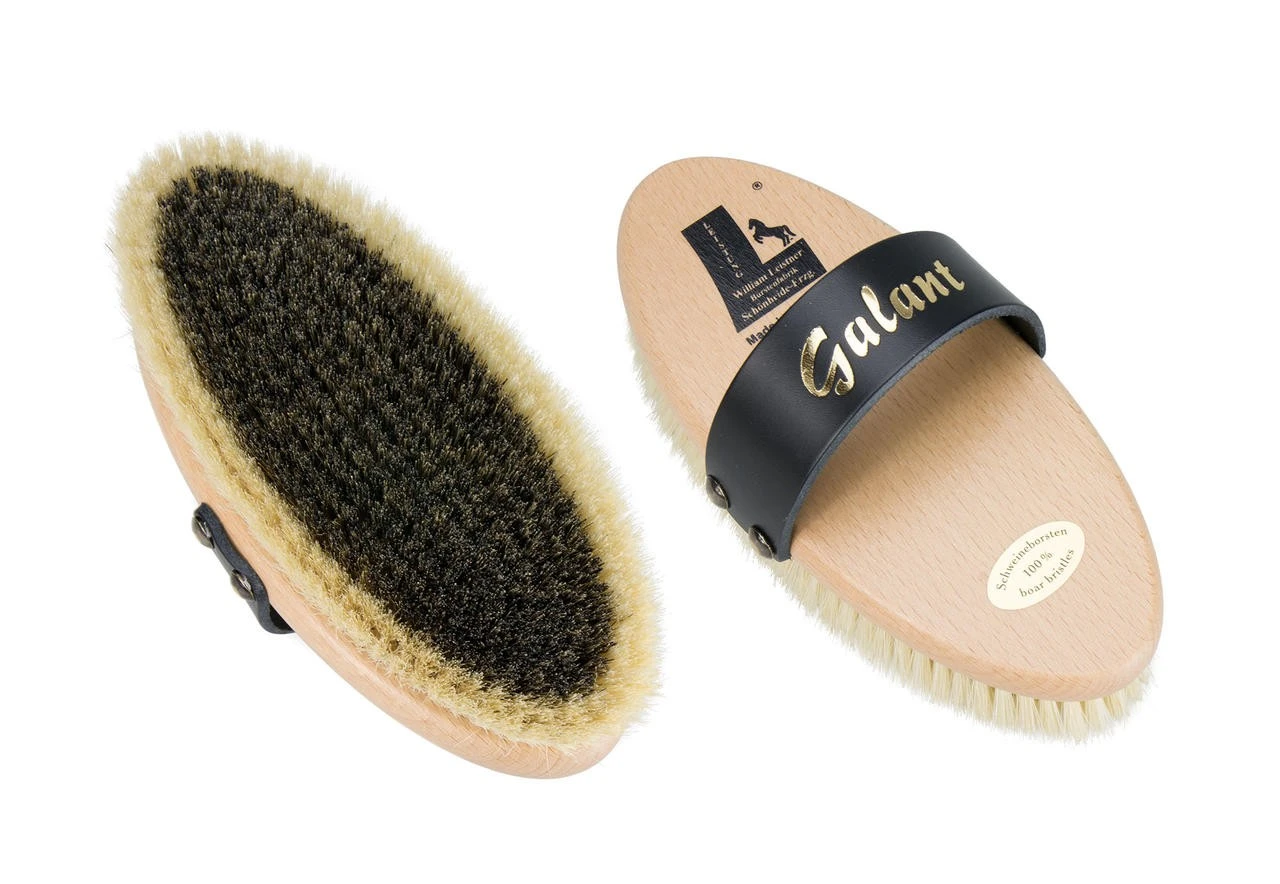 Die Kardätsche Galant von LEISTNER (Hersteller-Nr. 1 C 58) vereint ein hervorragendes Putzergebnis mit einem wohltuenden Massageerlebnis für das Pferd. Selbst stärkere Verschmutzungen können durch die straffen grau melierten Schweineborsten aus dem Fell entfernt werden. Diese transportieren das Fett von der Haut ins Fell und sorgen so für einen wunderbaren Glanz im Fell. Der doppelte Rand aus weißen Schweineborsten setzt noch ein optisches Highlight bei dieser hochwertigen Kardätsche. Durch die Verwendung von Naturmaterialien wird das Fell zudem perfekt gepflegt, da diese eine rückfettende Wirkung garantieren. Naturmaterialien erzeugen keine elektrostatische Aufladung.