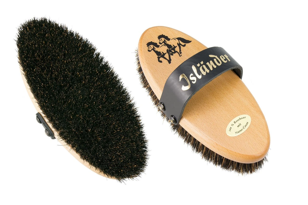 Die Kardätsche »Isländer« hat die perfekte Größe für eine schmalere bis durchschnittlich große Damenhand. Die Fertigung aus lackiertem PEFC-zertifizierten Buchenholz verspricht zudem eine antibakterielle Wirkung und ein angenehmes Gefühl in der Hand, auch bei sehr kühlen Temperaturen. Der hochwertige Ledergurt wird in Handarbeit genagelt und kann in der Länge gekürzt werden.