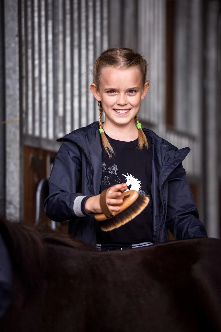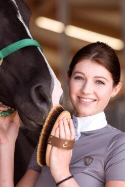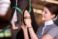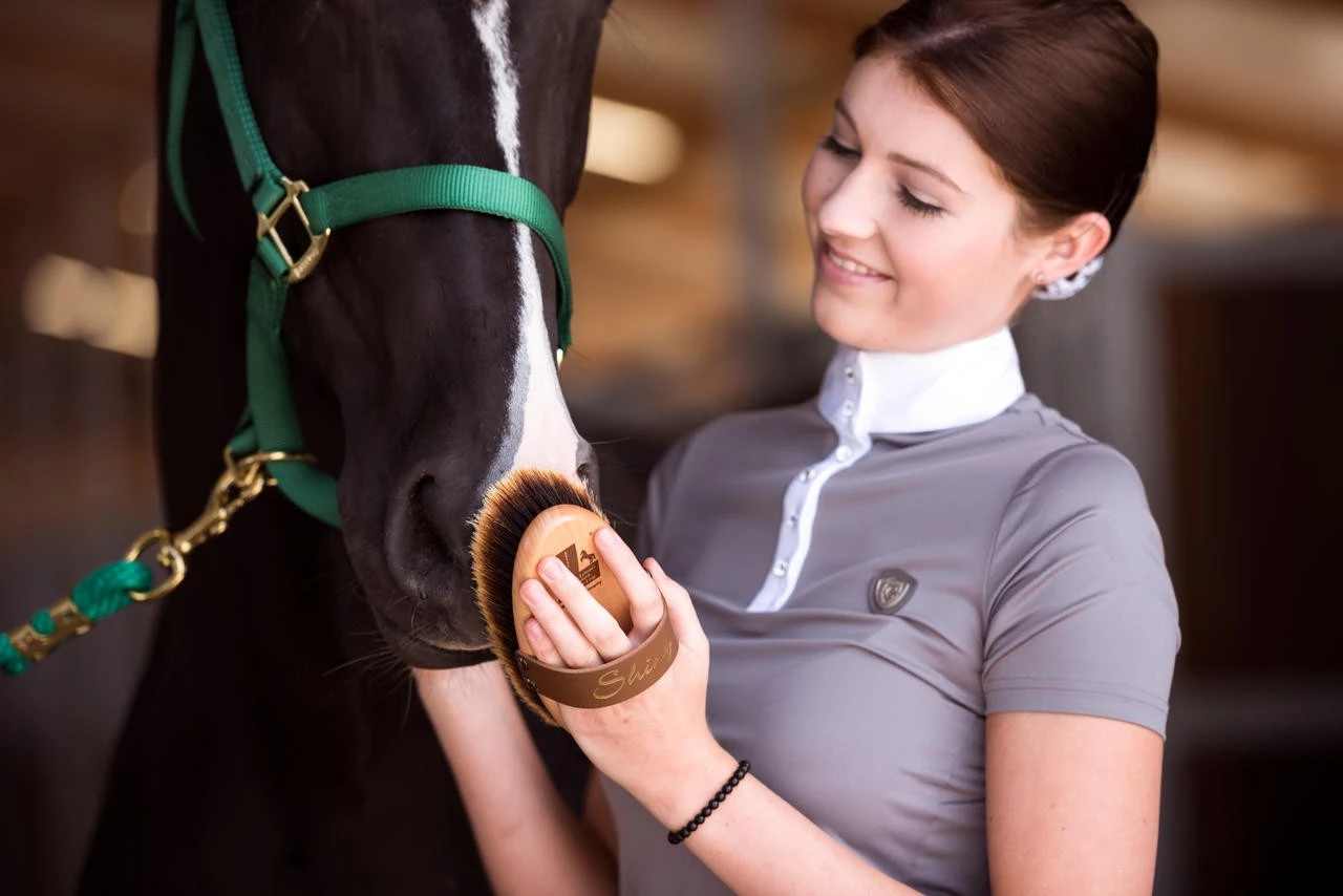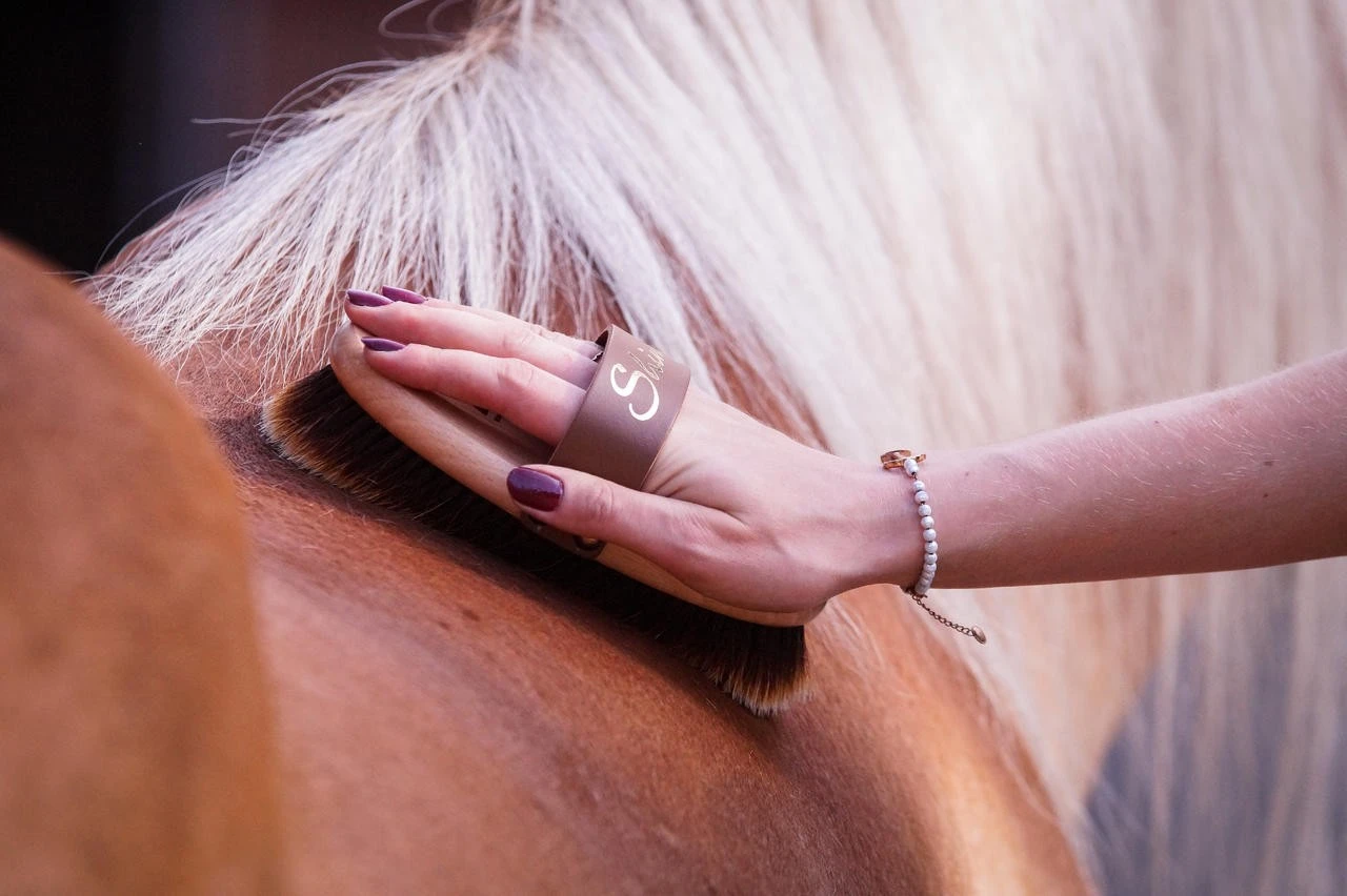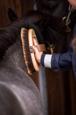 Das Rosshaar in bester Qualität aus dem Pferdeschweif mit hellen und besonders weichen Spitzen ist perfekt fürs Finish und verleiht dem Fell einen wunderschönen Glanz. Durch die Verwendung von Naturmaterialien wird das Fell zudem perfekt gepflegt, da diese eine rückfettende Wirkung garantieren. Naturmaterialien erzeugen keine elektrostatische Aufladung. Die Rosshaare sind sehr dicht gearbeitet und haben eine Länge von 37 mm. Die Kardätsche Shiny hat die perfekte Größe für eine schmalere bis durchschnittlich große Damenhand. Die Fertigung aus lackiertem PEFC-zertifizierten Buchenholz verspricht zudem eine antibakterielle Wirkung und ein angenehmes Gefühl in der Hand, auch bei sehr kühlen Temperaturen. Der hochwertige Ledergurt wird in Handarbeit genagelt und kann in der Länge gekürzt werden.