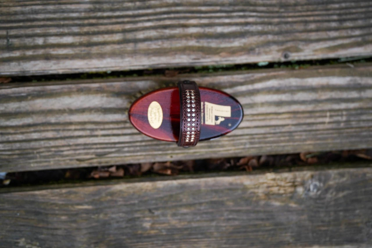 Die Pferdekopfkardätsche passt sowohl für eine Kinder- oder Damenhand. Die Fertigung aus FSC-zertifiziertem Buchenholz verspricht zudem eine antibakterielle Wirkung und ein angenehmes Gefühl in der Hand, auch bei sehr kühlen Temperaturen. Das Buchenholz hat eine sehr edle braun maserierte Lackierung. Der hochwertige Ledergurt wird in Handarbeit genagelt und kann in der Länge gekürzt werden.