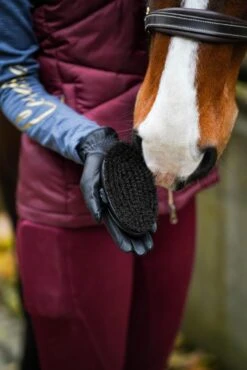 Die Pferdekopfkardätsche passt sowohl für eine Kinder- oder Damenhand. Die Fertigung aus farbig lackiertem PEFC-zertifiziertem Buchenholz verspricht zudem eine antibakterielle Wirkung und ein angenehmes Gefühl in der Hand, auch bei sehr kühlen Temperaturen. Der hochwertige und superbequeme Elchledergurt ist mit Kristallen von SWAROVSKI® verziert und mit weichem Elchleder gefüttert. Der Gurt wird in Handarbeit genagelt und kann in der Länge gekürzt werden.