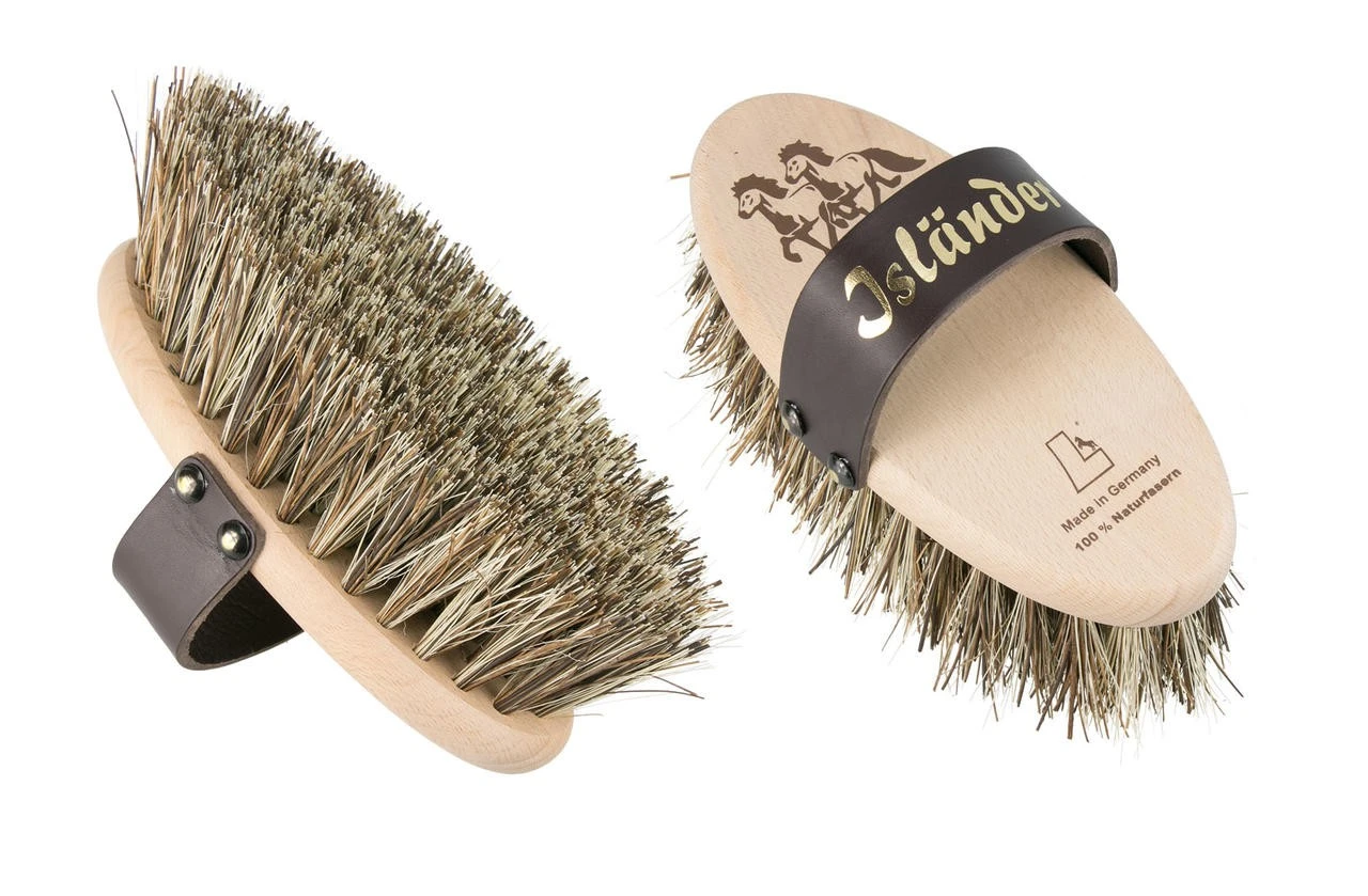 Die Wurzelbürste Isländer von LEISTNER (Hersteller-Nr. 3 D 63) dient zur Vorreinigung verdreckter Pferde, vor allem bei Weidehaltung. Die extra straffen Naturfasern sind sehr dicht und lang gearbeitet. Dadurch können auch hartnäckigste Verkrustungen gelöst und aus dem Fell entfernt werden. Durch die Verwendung von Naturmaterialien werden Haut und Fell geschont und keine elektrostatische Aufladung erzeugt.