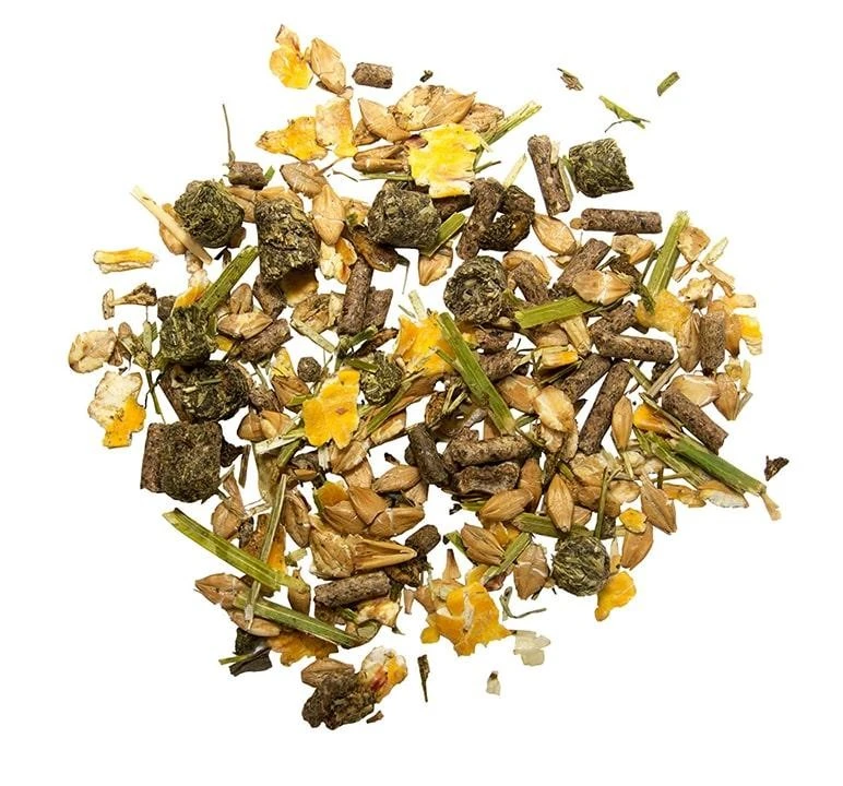 Gerstenflocken (33,00 %), Gras, hochtemperaturgetrocknet (20,00 %), Maisflocken (15,00 %), Weizengrießkleie (9,00 %), Rübenmelasseschnitzel, getrocknet (9,00 %), Kräuter (Brennnessel, Kamille, Melisse, Löwenzahnwurzel, Stiefmütterchenkraut, Spitzwegerich, Salbei, Walnussblätter) (4,50 %), Rübenmelasse (2,90 %), Luzerne, hochtemperaturgetrocknet (2,00 %), Calciumcarbonat (1,30 %), Natriumchlorid (0,65 %), Traubentrockentrester (0,60 %), Knoblauch, getrocknet (granuliert) (0,50 %), Monocalciumphosphat (0,25 %), Magnesiumoxid (0,20 %), Bierhefe (0,10 %)