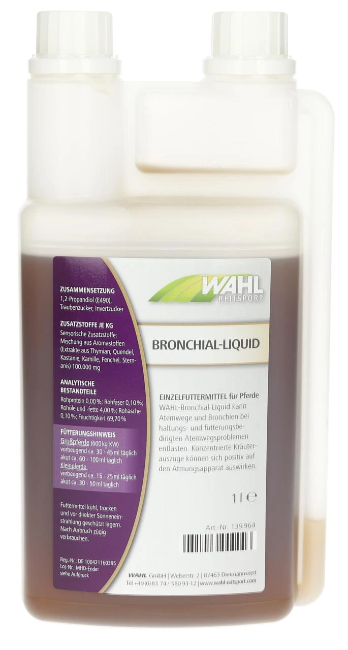 WAHL-Bronchial Liquid ist ein ErgĂ€nzungsfuttermittel fĂŒr Pferde und kann Atemwege und Bronchien bei haltungs- und fĂŒtterungsbedingten Atemwegsproblemen entlasten. Konzentrierte KrĂ€uterauszĂŒge können sich positiv auf den Atmungsapparat auswirken.