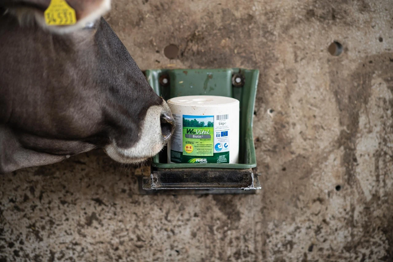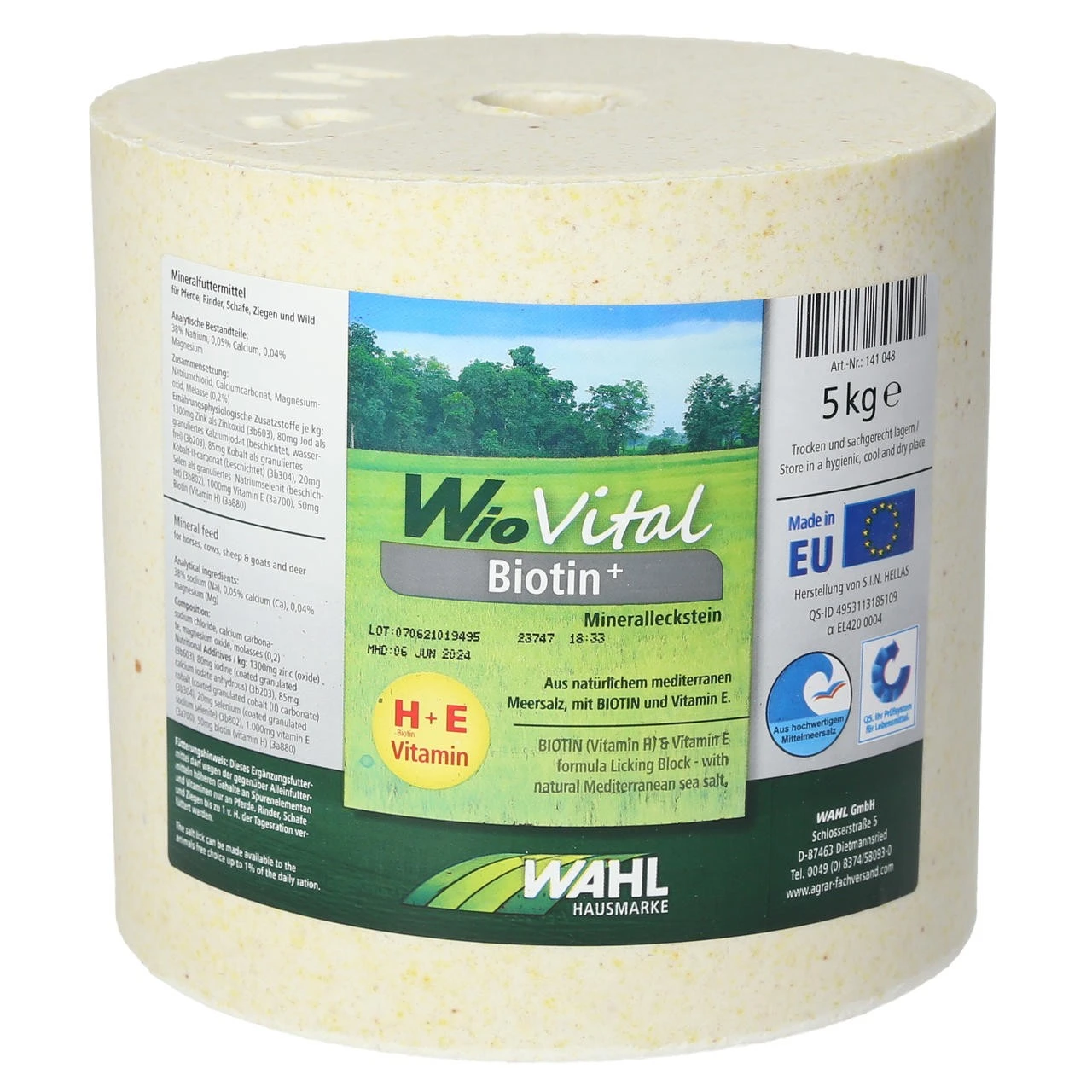 Der Leckstein WioVital Biotin+ ergänzt die tägliche Nahrung ideal mit Salz, Spurenelementen und BIOTIN und ist ein Mineralfuttermittel für Pferde, Rinder, Schafe, Ziegen und Wild. Er ist ein spezieller Mineralsalzleckstein.