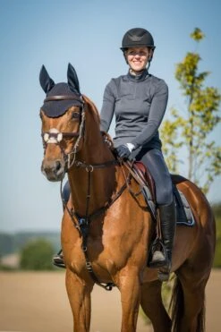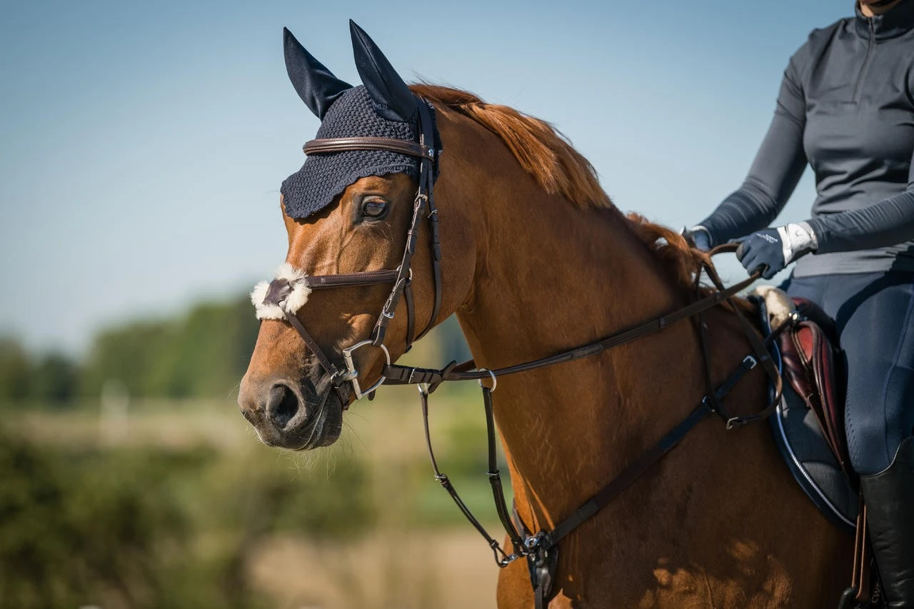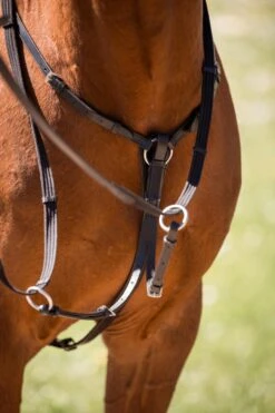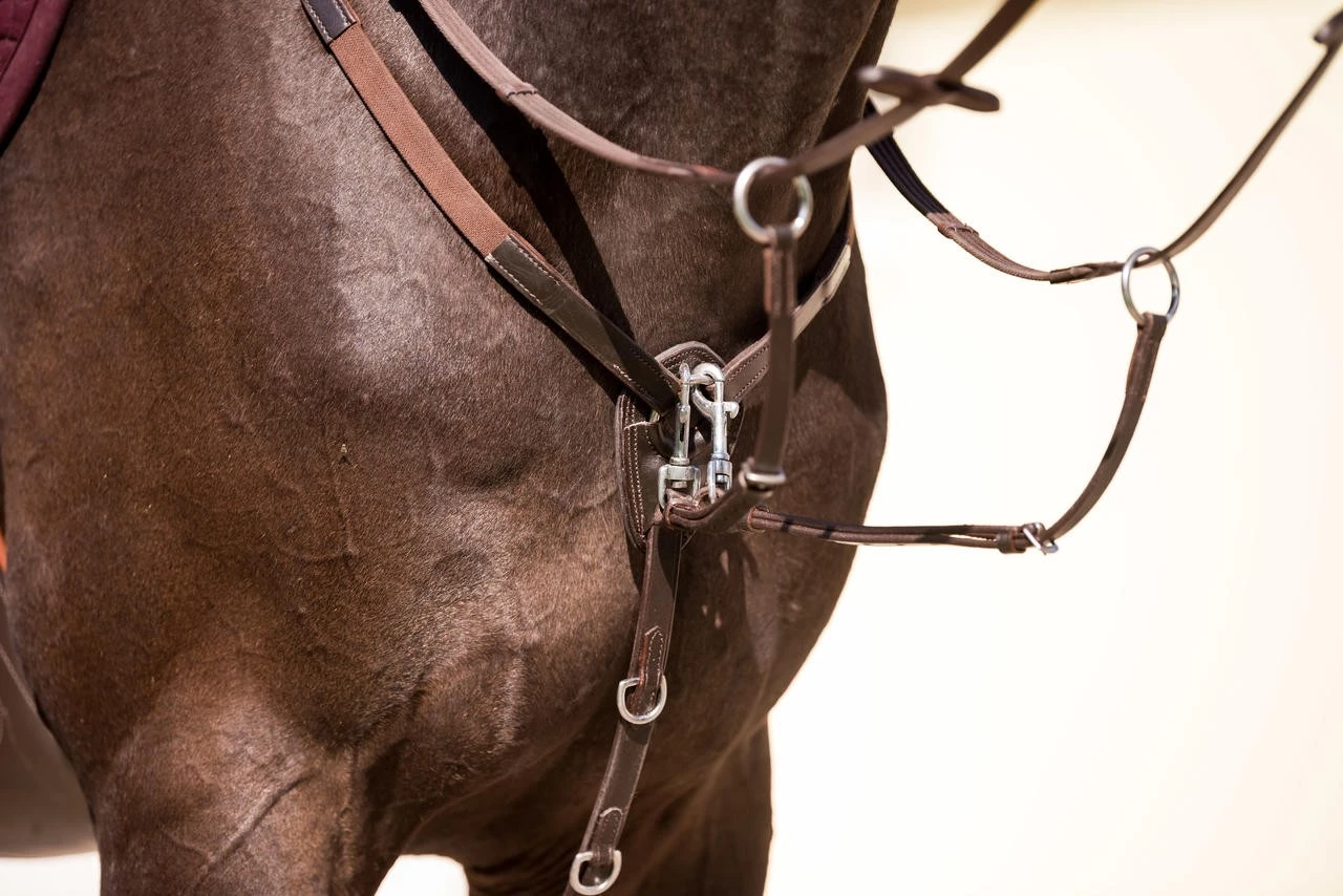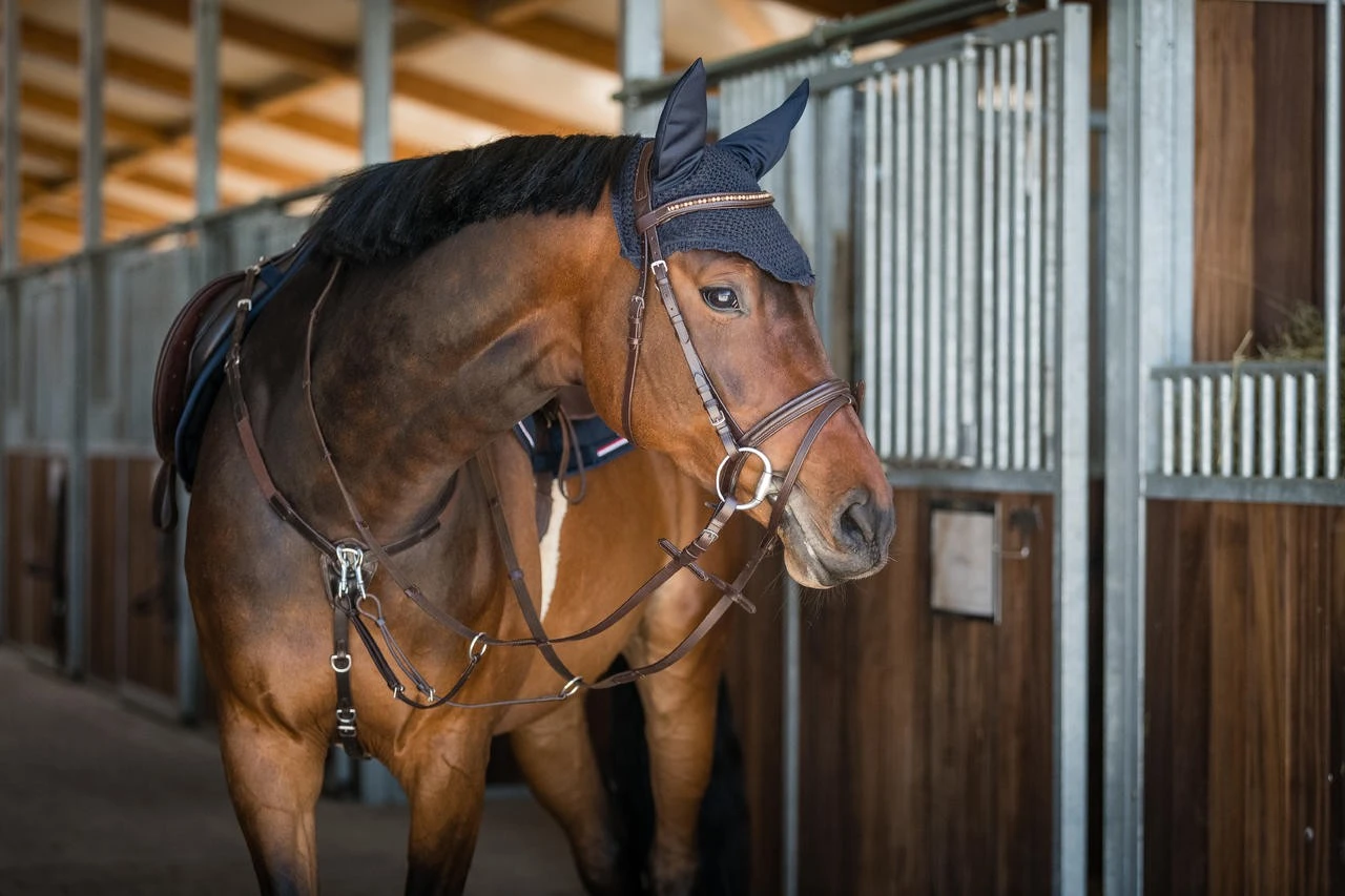 Schickes Vorderzeug mit abnehmbarer Martingalgabel und elastischem Einsatz am Halsteil.